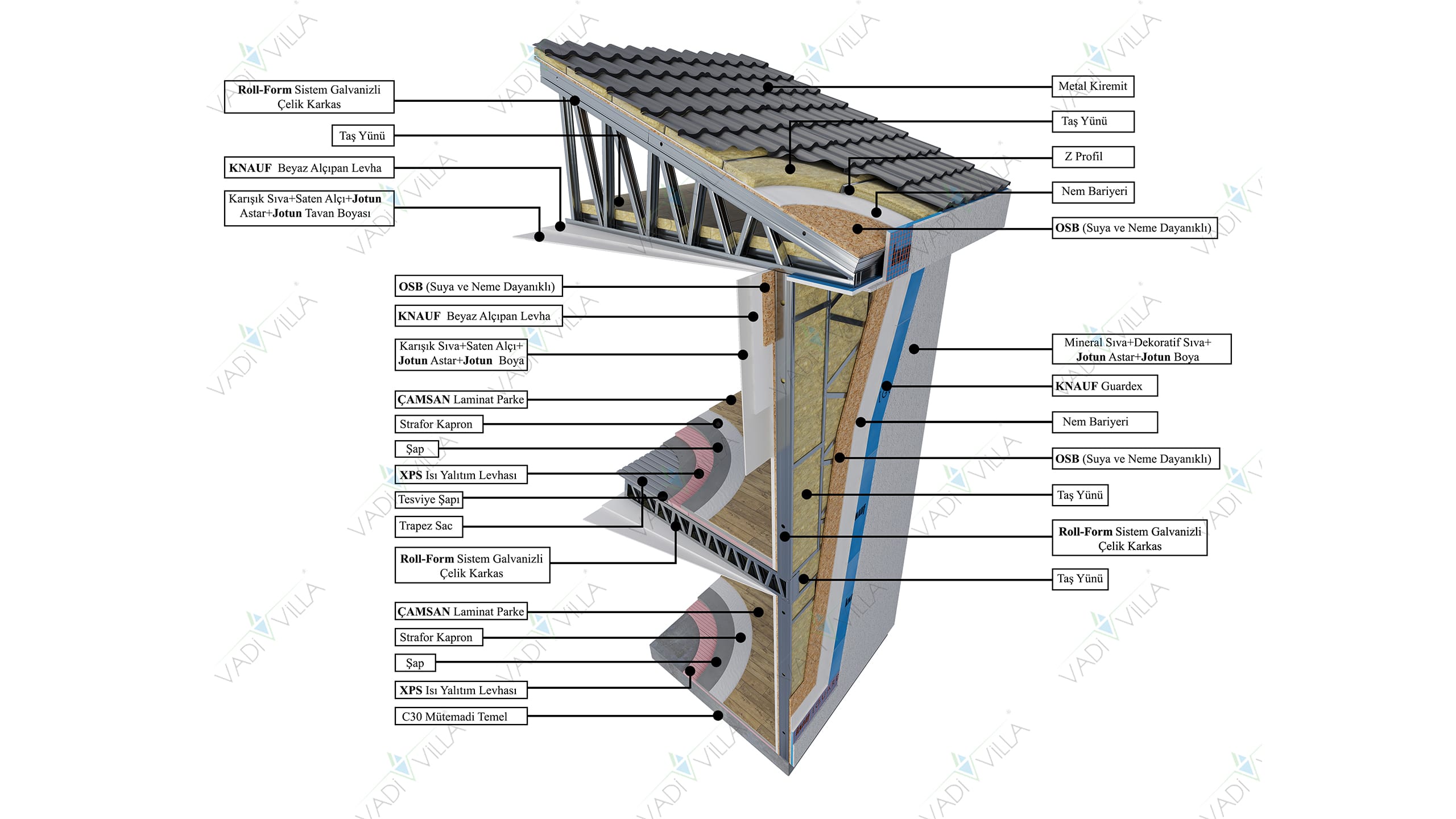 Çift katlı çelik villa, çatının sadece tavan izolasyonu amacıyla kullanılmadığı, binanın tamamına estetik değer ve fazladan kullanım alanı kattığı hallerde oluşturulan yeni nesil evlerdendir. Doğru detaylandırılmış, tüm aşamaları uygun şekilde tasarlanmış çatı katlı çelik bir villa, her anlamda mülk sahibini memnun eder. Çelik konstrüksiyon yapılarda, tıpkı diğer klasik yapılarda olduğu gibi, doğru planlama ve uygulama esastır. Herhangi bir aşamada yaşanan eksiklik tüm inşa sürecini ve ortaya konulacak olan yapıyı doğrudan etkileyecektir. Bu nedenle Vadi Villa kalitesi ve güvencesi ile hazırlanan çatı katlı çelik yuvanıza daha huzurlu ve daha emin bir halde yerleşebilirsiniz. Çelikten de olsa bir yuvanın hazırlanması profesyonel özen ister.