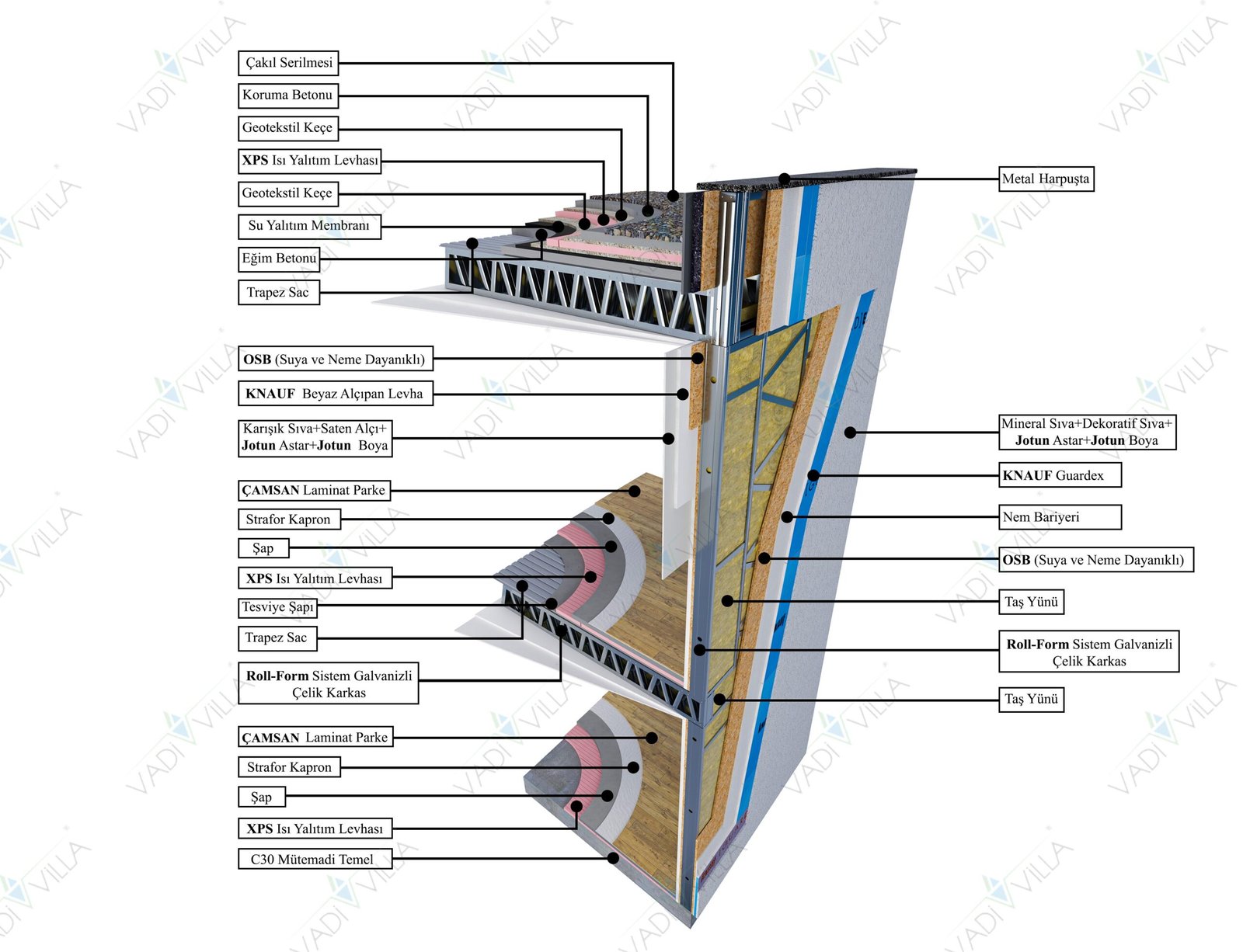Bu çift katlı çelik villa, hem sağlam yapısıyla hem de estetik mimarisiyle müstakil yaşam hayali kuranlara hitap ediyor. Teknik detaylara önem verenler için projeye özel kesit görselleri ve planlar da hazırlanmıştır.