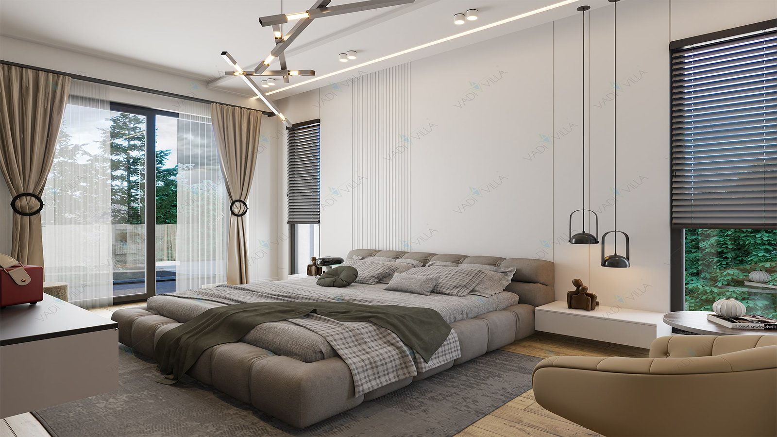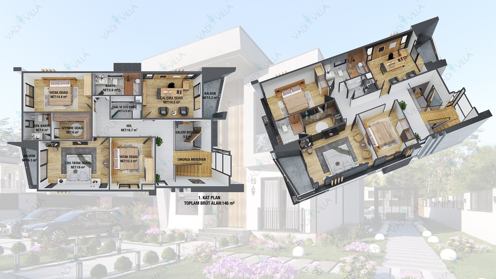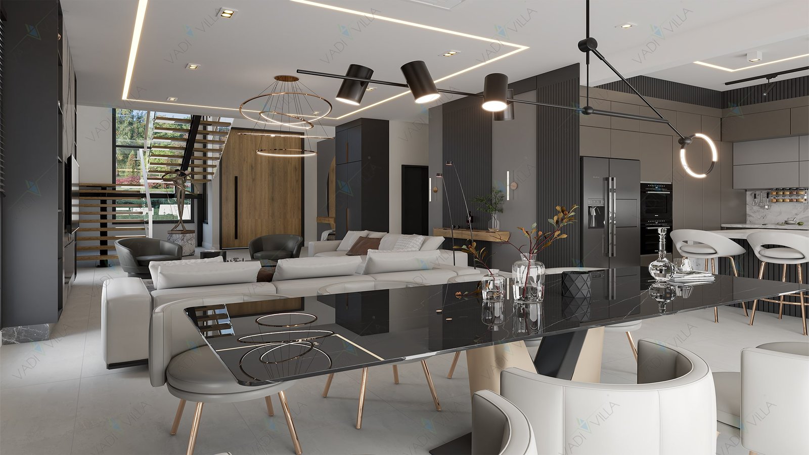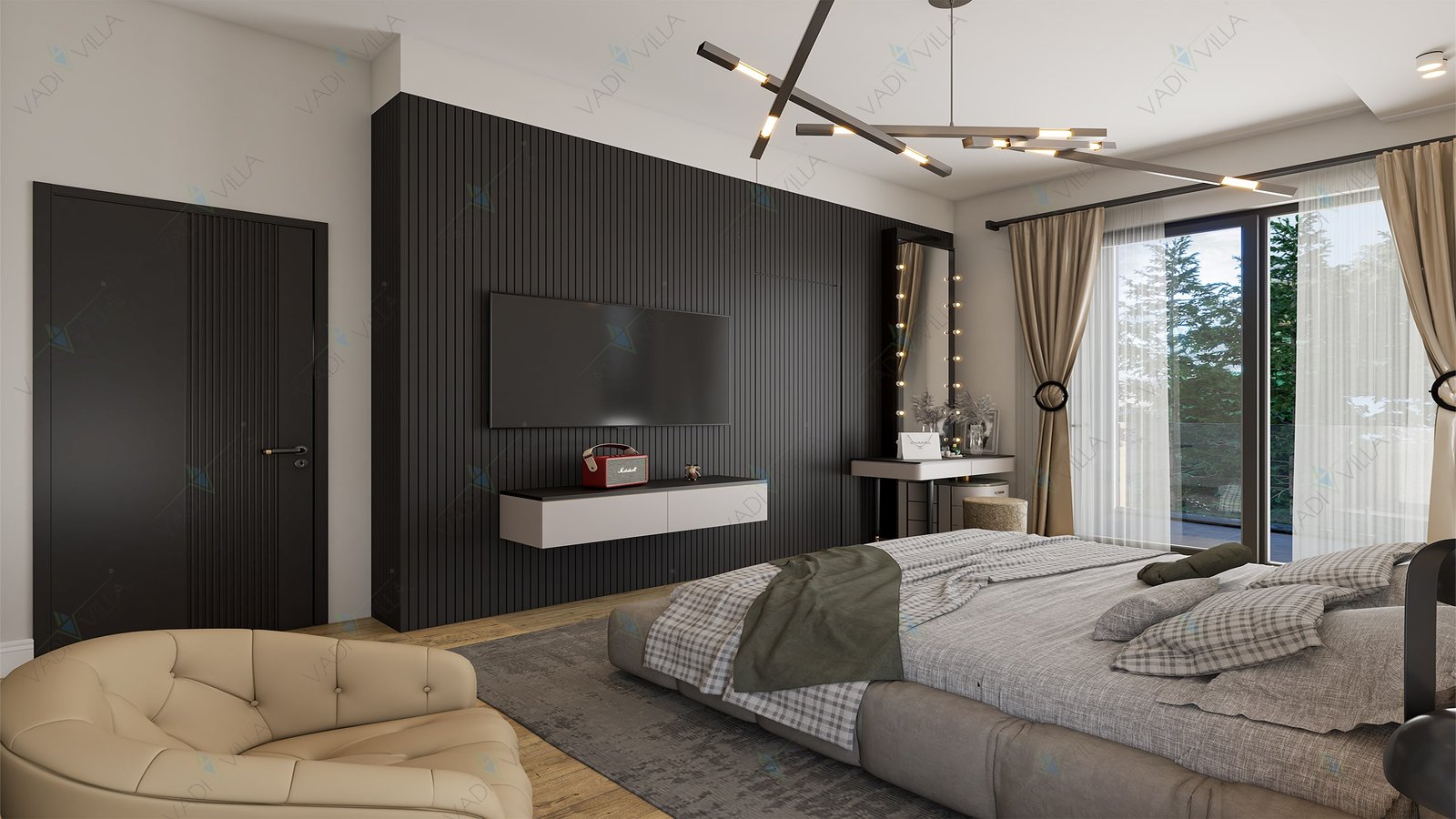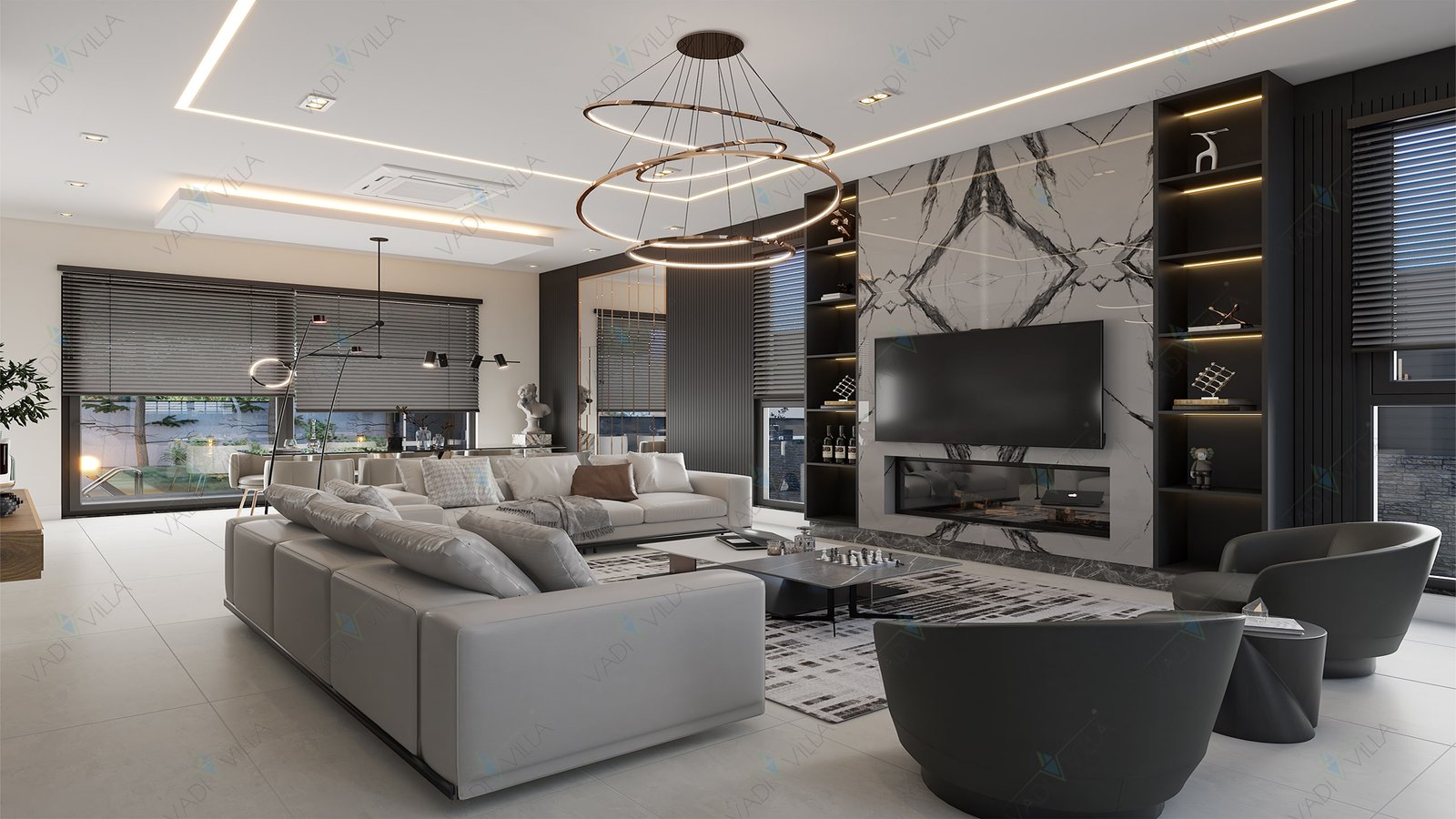 Tüm mekânlar, Premium paket standartlarına uygun şekilde yüksek kalite yüzeyler, modern mimari dokular ve özenle seçilmiş donatılarla tamamlanmıştır. Bu planlama yaklaşımı; geniş kullanım alanı, akıcı dolaşım, güçlü depolama çözümleri ve günümüz yaşam alışkanlıklarına uyumlu teknolojik detaylarla birleşerek villanın her bir noktasında üst düzey bir yaşam deneyimi sunar.