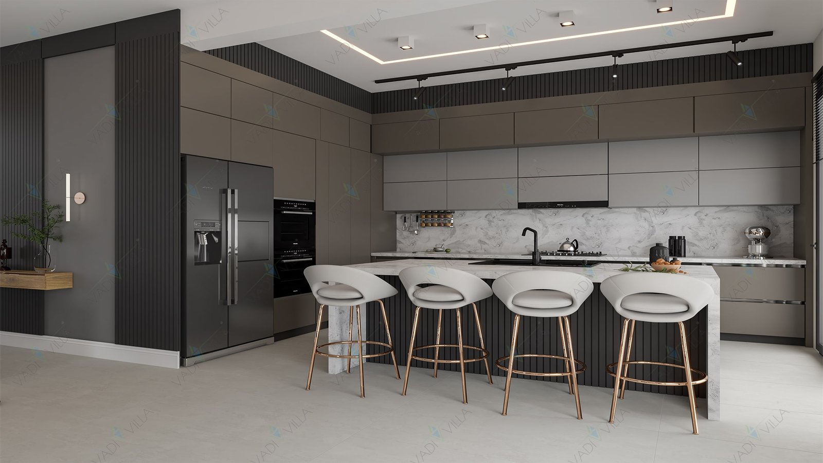 Premium paket kapsamında tasarlanan bu çift katlı çelik villa, modern aile yaşamına maksimum konfor ve fonksiyon kazandıran ileri seviye bir planlama anlayışıyla geliştirilmiştir. Zemin katta yer alan geniş salon–mutfak bütünleşmesi, yüksek kalite kaplamalar ve geniş açıklıklı doğramalarla desteklenerek ferah, aydınlık ve kusursuz bir yaşam alanı oluşturur. Mutfağa entegre arka mutfak, depolama kapasitesi, hazırlık tezgâhı ve kapalı geçiş sistemi sayesinde hem düzeni korur hem de daha profesyonel bir mutfak deneyimi sunar.